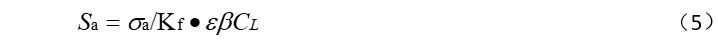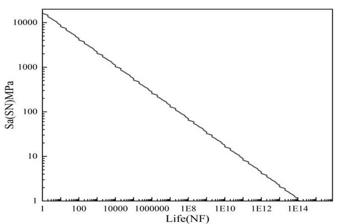 圖8 各節點等效應力與時間周期關系 3.4 FE-safe的疲勞仿真與計算 疲勞分析運用應力法,以材料的S-N曲線為基礎,使用疲勞累積損傷理論與名義應力,分析了疲勞危險部位的疲勞強度,并預測材料結構的疲勞壽命。材料S-N曲線的獲得,通常情況下有兩種方法:一種是以材料的屈服強度、抗拉強度和楊氏模量為基礎,然后通過算法計算獲得;另外一種是直接通過疲勞試驗進行測得。以上兩種方法全都需要對獲取的S-N曲線進行平均應力修正來達到計算的要求。對S-N曲線修正時,需要考慮各種因素的影響,各因素間的關系為。