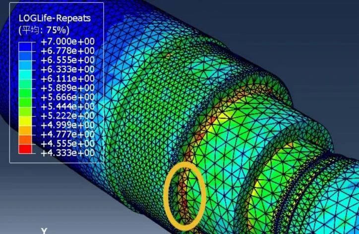 圖9 修正得到的材料S-N曲線 將FE-safe計算得到的疲勞分析結果文件進行保存,在ABAQUS中看模具型芯疲勞壽命的分布云圖,見圖10,可以看到,疲勞壽命較低的區域在A點區域。通過對H13模具型芯進行疲勞失效試驗獲得的疲勞裂紋產生區域和FE-safe計算得到的疲勞最短壽命區域位置基本一致,見圖11,驗證了有限元模型模擬的可靠性。