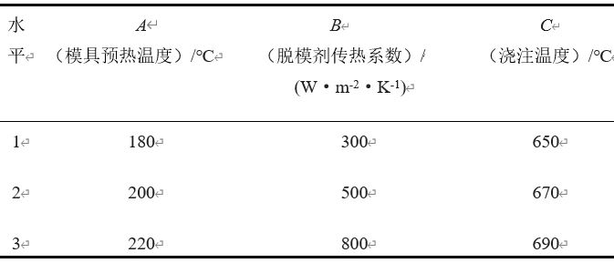 圖11 疲勞失效裂紋產生區域 4、正交試驗設計及結果分析 4.1 正交試驗設計 壓鑄過程中,影響模具型芯表面溫度和熱應力的因素很多,主要為鑄件澆注溫度,模具預熱溫度以及脫模劑的傳熱系數,因此建立了3因素3水平的正交試驗,見表1。