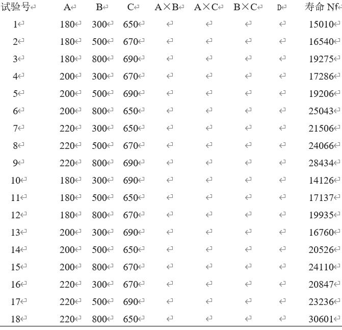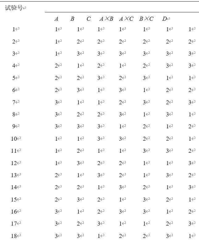 表1 因素水平表 試驗選擇正交表L18(37),見表2。