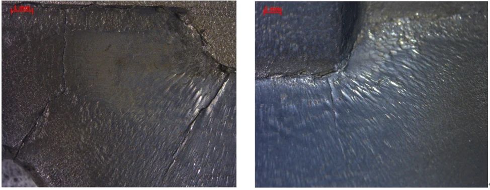 表4 正交疲勞壽命試驗結果分析表 從表4的極差Qc的值可以得到,因素A的水平變動對模具型芯的壽命影響最大,q其次是因素B最差是因素C,因素A與因素C的交互作用排第4。 從表4可以得到,獲得模具型芯最大疲勞壽命的最佳參數組合為A3B3C1(模具預熱溫度為220 ℃、脫模劑傳熱系數為800 W/( ㎡·K)、澆注溫度為650 ℃)。 5、試驗驗證 選用模擬得出的泵殼壓鑄模具型芯最優壓鑄工藝參數對其進行熱疲勞試驗。在模具型芯分別進行了10 000、20 000、30 000次的壓鑄循環后,根據模擬結果對模具型芯容易產生熱疲勞裂紋的區域進行體顯微鏡的觀察,發現在30 000次壓鑄循環的時候,模具型芯開始出現熱疲勞裂紋,見圖12??梢缘贸鲈趯嶋H壓鑄過程中,得到的熱疲勞壽命結果與模擬得到的結果基本一致。