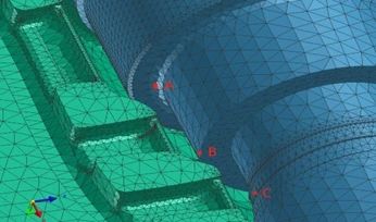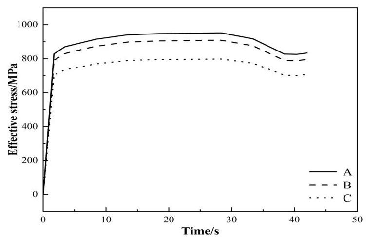 圖7 模具型芯約束狀態 3.3 熱應力的分析結果 整個模具型芯表層在熱平衡狀態下的一個循環周期內的表層熱應力變化情況見圖8。在模具開模前,模具型芯表層膨脹,受到壓應力;開模后,模具型芯表層收縮,受拉應力。在循環周期內A、B、C 3點的最大等效熱應力值逐漸減小,由A點的943 MPa降至C點的756 MPa。將熱平衡狀態下的循環周期的熱應力結果文件進行導出,導入到ABAQUS的FE-safe模塊中進行疲勞結果的仿真與計算。