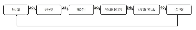 圖2 選取的分析點 1.2 ProCAST模擬參數的設置 根據工廠的實際工況,將壓鑄溫度設為670 ℃,模具預熱溫度為220 ℃,空氣環境設為20 ℃,冷卻水管直徑為10 mm,冷卻水流速為10 mm/s,一個壓鑄循環的生產周期為42 s。第20 s開模,第25 s取件,第30 s開始噴涂膜劑,第36 s結束噴涂,第40 s合模。壓鑄具體流程見圖3。