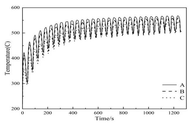 式中,h為冷卻水與模具間的傳熱系數;Nμ為努爾指數;Re為雷諾數;λ為水的傳熱系數;Pr為普朗常數;ρ為水的密度;v為水的流速;D為冷卻水管直徑;μ為動力粘度;a為導熱系數。 冷卻水道的直徑為10 mm,冷卻水流速為1 m/s,通過計算得到的冷卻水與模具的傳熱系數為5 000 W/(㎡·K)。 2.3 連續壓鑄達平衡態下溫度場模擬分析 圖4為試驗的特征點溫度-時間圖??梢钥闯觯S著壓鑄循環進行,溫度增幅越來越小,大約15次壓鑄循環之后,壓鑄模進入了熱平衡狀態。從熱平衡狀態下可看到,A點的溫度上升較快,B點的溫度上升較慢,C點的溫度上升最慢。圖5為試驗的第15次循環特征點溫度-時間圖,在第15次循環周期中25 s開始時,A、B、C 3點的溫度下降速度變快,是因為模具開模,模具型芯與空氣接觸,溫度下降;在30 s時,溫度下降速度最快,這是因為在30 s時開始噴涂脫模劑,由于脫模劑的作用,模具型芯溫度開始迅速下降。分析得到的特征點溫度-時間云圖與實際工況中的特征點位置的溫度循環變化基本一致,驗證了有限元模型模擬的可靠性。 將熱平衡狀態下的第15次壓鑄循環的溫度場的數值模擬結果導出,用模擬的結果為熱循環載荷,導入到ABAQUS中進行下一步的熱應力模擬。