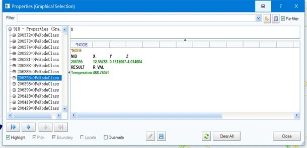 圖5 第15次循環特征點時間溫度曲線 2.4 ProCAST溫度場模擬結果的導出 在ProCAST的后處理界面中選定要導出的溫度場結果及相應的時間步數區間,如第15次循環的溫度場結果,在Selection工具欄target list黑色箭頭選中Node,然后在Selection工具欄最右端有一個向下箭頭,用來確定選取模具型芯表面節點的方式,然后將整個模具型芯的節點進行框選,右鍵屬性即可將所選的每個節點的溫度以及節點對應的三維坐標結果進行提取顯示,具體提取結果見圖6。