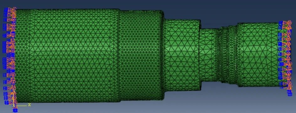 3、熱應力數值模擬以及疲勞壽命計算 把ProCAST中劃分好的網格模具型芯模型直接進行保存,在ABAQUS中直接將保存好的模具型芯網格文件打開, ProCAST中導出的模型文件不包括模具型芯的材料屬性,所以要在ABAQUS中重新定義模具型芯材料的屬性,H13鋼密度設為7 876 kg/m³,楊氏模量設為210 GPa,泊松比設為0.3。 3.2 溫度載荷的加載和邊界條件的設置 模具型芯在實際服役過程中,最開始前幾次循環的非熱平衡狀態下產生的熱應力在整個模具型芯服役過程中占比非常小,且對整個服役過程沒有太大的影響,所以忽略。模具型芯絕大部分工作時間狀態為熱平衡狀態,因此模擬模具型芯熱應力場的載荷選用熱平衡狀態下的溫度載荷。將ProCAST計算得到的熱平衡狀態下的溫度場結果和對應節點的三維坐標導入到ABAQUS的模型中作為溫度載荷進行加載。在實際工況下,此模具型芯的約束情況是兩端固定,所以在ABAQUS中也進行兩端固定的約束設置,見圖7。