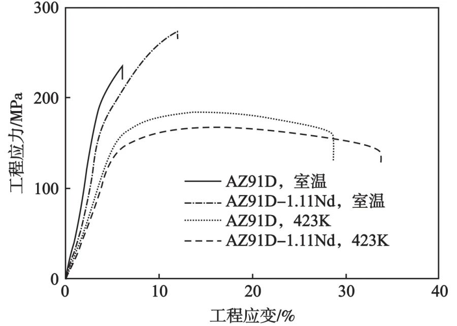 圖6 壓鑄態AZ91D與AZ91D-1.11Nd合金的室溫和高溫拉伸工程應力-應變曲線