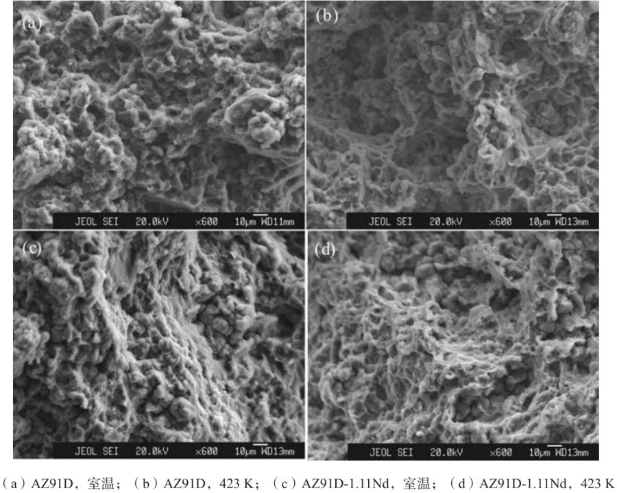 表2 壓鑄態AZ91D與AZ91D-1.11Nd合金的力學性能、導熱性和流動性 Su等人使用高壓壓鑄法制備了Mg-4Al-4Nd-0.2Mn合金,該合金有針狀Al11Nd3和顆粒狀Al2Nd兩種金屬間相,室溫和473 K時均表現出良好的強度,Al11Nd3完全分解為Al2Nd后合金室溫強度下降。這是因為Al11Nd3和Al2Nd在晶粒和晶界形成的網狀結構強化晶界,其中Al11Nd3為主要強化相;Al11Nd3完全分解為Al2Nd后,晶界附近的網狀結構解體,合金室溫強度下降。 本試驗所鑄AZ91D-1.11Nd合金中有Al 2 Nd和少量針狀Al11Nd3 ,Al2Nd和Al11Nd3沒有在晶界處形成網狀結構,而且很多Al2Nd分布在晶粒內部,423 K時不能有效阻止晶界開裂;但是AZ91D合金中仍有大量網狀β-Mg17Al12存在,423 K時能夠阻止晶界開裂,所以AZ91D-1.11Nd合金423 K拉伸強度低于AZ91D合金。 圖7a、c為壓鑄態AZ91D和AZ91D-1.11Nd合金室溫拉伸斷口形貌。可見,AZ91D合金拉伸斷口分布著微孔聚集型等軸韌窩,局部可見撕裂棱和河流狀花樣,為準解理斷裂、塑韌混合斷裂,AZ91D-1.11Nd合金韌窩數量有所增加,且相對較深,與更好塑性結果相一致。圖7b、d為壓鑄AZ91D和AZ91D-1.11Nd合金高溫拉伸斷口形貌,兩個拉伸斷口分布著大量等軸韌窩,為微孔聚集型斷裂、塑性斷裂,AZ91D合金韌窩更多,更加均勻分布,表現出較好的塑性,與拉伸試驗結果一致。