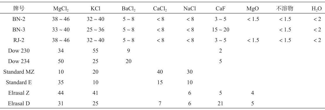 表6 耐熱鎂合金常用添加元素及其作用機制 3.3?阻燃鎂合金 鎂合金熔點低,熔煉時易氧化燃燒形成多孔性疏松MgO層,其密度僅為0.8,無法有效覆蓋熔體表面阻止繼續燃燒,因此鎂合金熔煉必須采用阻燃防護。鎂合金阻燃防護主要包括熔劑防護、氣體防護與合金化阻燃防護,其作用機制均為覆蓋鎂合金熔體表面,阻止鎂與空氣持續接觸以阻止燃燒。表7為鎂合金常用的保護熔劑化學成分配比。鎂合金氣體防護可分為兩類:(1)選用CO?、SO?或含F(六氟化硫SF6 、四氟乙烷HFC-134a、氟化酮等)反應性氣體;(2)選用Ar等惰性氣體。鎂合金阻燃防護一般常添加Ca、Be、Zn與稀土元素,反應生成的氧化物密度一般高于1,可有效覆蓋熔體表面,起到良好的保護效果。