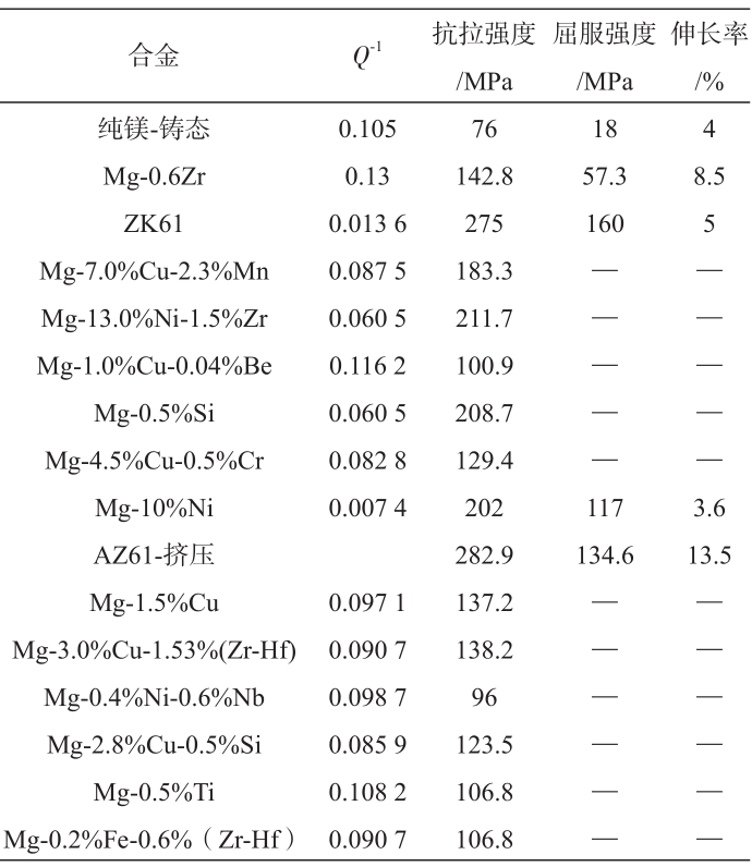 3.6?阻尼鎂合金 與橡膠、塑料阻尼板、泡沫塑料、阻尼復合材料、阻尼涂料等有機材料相比,鎂合金密度低、比剛度高、抗電磁屏蔽與輻射能力強,且具有極佳的減振性能,目前已在航天衛星、運載火箭、槍械、智能機器人、無人機等領域得到了廣泛應用,引起了學術界的廣泛關注 。金屬材料的阻尼機制主要分為位錯型阻尼、復相型阻尼、鐵磁型阻尼以及欒晶型或晶界型阻尼,低溫下鎂合金阻尼機制為位錯阻尼,滿足Granato和Lucke提出的位錯釘扎-脫釘模型,即G-L理論;高溫環境下除了位錯阻尼作用機制外,還含有晶界阻尼。鎂合金阻尼性能的改善可通過以下三種工藝方法實現:晶粒細化與位錯強化、鎂基復合材料和熱處理調控。表8為幾種常見鎂合金的阻尼性能與力學性能。
