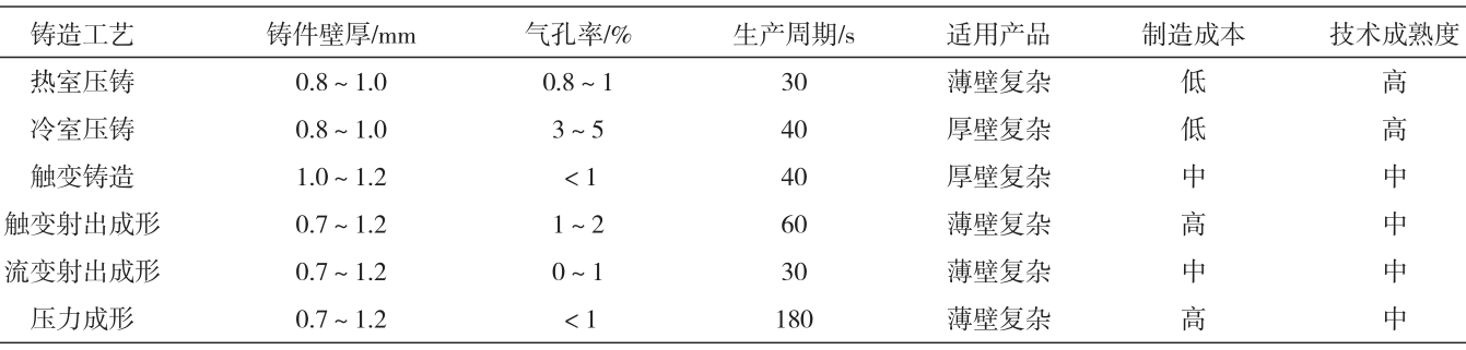 表9 常用壓鑄鎂合金的力學性能 4、鎂合金加工技術研究現狀及發展趨勢 鎂合金鑄件占所有鎂合金加工成形工藝制件總量的40%,壓鑄占比鎂合金鑄造制件總量的65%以上。鎂合金壓鑄分為冷室壓鑄與熱室壓鑄,冷室壓鑄又分為立式壓鑄與臥式壓鑄,除壓鑄外還包括砂型鑄造、擠壓鑄造、半固態觸變成形鑄造與觸變成形鑄造。航空航天用鎂合金制件由于批量小、品種多,一般多選用砂型鑄造。擠壓鑄造常選用較低的充型速度與最小的撓度,充型速度一般不大于2m/s,充型壓力不低于70MPa。擠壓鑄件按熱處理強化工藝又可分為直接擠壓鑄造與間接擠壓鑄造。半固態觸變成形鑄造是將合金熔體加熱到含有球狀固相組分的半固態漿料,擠壓至模具進行成形制造。觸變鑄造是將制備的球狀晶體(觸變材料)鑄錠或棒料再次加熱到固液糊狀區,借助壓鑄或鍛壓設備加壓成形,成形的制件具有致密度高、力學性能高的特點。鎂合金壓鑄與擠壓成形工藝的典型力學性能見表10。表11所示為鎂合金不同成形制造工藝的對比結果。