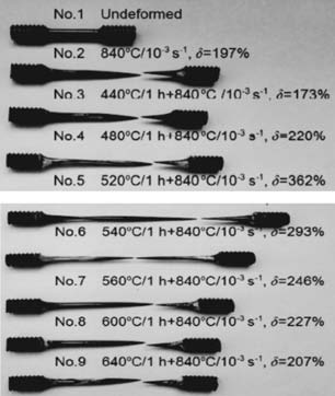 表11 鎂合金鑄造成形制造方法對比 與常規的鑄造成形工藝相比,可采用鍛造、擠壓或軋制等塑性成形工藝細化材料內部微觀組織,消除材料內部的氣孔、疏松等鑄造缺陷,提高材料力學性能。常用的高強鎂合金多為變形鎂合金,如M1、M2、AZ31、AZ61、AZ63、AZ80、ZK60等牌號;軋制成形鎂合金多選用Mg-Mn系合金(如MB1、MB8)或Mg-Al-Zn系(AZ31B)與Mg-Li系(LA141),用于制造中厚板與薄板產品。鎂合金室溫擠壓工藝性較差,擠壓溫度一般高于150 ℃,在175 ℃擠壓溫度下擠壓比可達2.0,在225 ℃下可達3.0,常用的擠壓鎂合金多為AZ31B、ZM21、ZK60A與HK31等。鎂合金室溫鍛造極易開裂,鍛造溫度一般控制在200~400 ℃,當鍛造溫度超出400 ℃時,易產生腐蝕氧化、晶粒粗大等,鍛造工藝性能較差。 與多數金屬材料不同,鎂合金通過選擇合適的組織結構與形變溫度可獲得良好的超塑性,可在應變速率大于0.01 s下獲得高達100%以上的伸長率,實現薄壁精密結構的精確成形。MB26鎂合金在1.67×10﹣³ ~4.1×10-² s-¹ 應變速率與250~480 ℃溫度下具有良好的超塑性;當溫度升至350~450 ℃時伸長率可高達520%,在1.17×10-³ s-¹應變速率與400 ℃下伸長率可達1450%。圖6為鎂合金超塑性成形斷后伸長率的實物示意圖。
