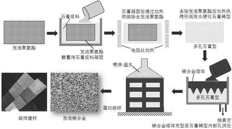 表12 噴射沉積制備鎂基工程合金的力學性能 除上述加工工藝外,鎂合金較為成熟的加工成形技術還包括大塑性成形技術、等徑角擠壓技術、高壓扭轉技術、攪拌摩擦加工技術與累積軋制技術。大塑性成形技術SPD可直接將材料內部組織細化至亞微米乃至納米級,晶粒細化效果顯著,可分為等通道轉角擠壓與累積疊軋。等徑角擠壓ECAP具有兩個截面相同的通道模具,材料在擠壓作用下經過兩個通道的轉角處(多為90°、120°)產生大剪切塑性變形,經多次重復擠壓可獲得較高的應變量。高壓扭轉HPT可細化材料組織并改善材料性能。由于扭轉時距中心距離有所差異,材料內部各區域的晶粒細化程度略有差異。攪拌摩擦加工FSP在攪拌頭劇烈作用下可產生劇烈的塑性變形,實現材料晶粒細化、微觀組織均勻化與致密化。累積軋制對板材進行裁剪、堆垛、軋制、再裁剪,并多次重復循環,以獲得所需的累積應變量,具有與ECAE相當的晶粒細化能力,軋制次數越多,材料內部組織越均勻。 在鎂合金的加工過程中,不可避免地將產生一些加工碎屑與邊角料。為了實現變廢為寶,可將石膏漿料滲透到發泡聚氨酯棉內部,再通過加熱燃燒去除掉發泡聚氨酯,得到多孔性石膏模具。在石膏模具烘烤焙燒后,對其抽真空利用壓力將鎂合金熔體滲透到多孔性石膏模具內,采用噴淋與震動破碎清除石膏后即可獲得具有連通孔洞的發泡鎂合金材料,此工藝制備的發泡鎂合金材料可廣泛應用于建材、裝飾等行業,整個工藝制備過程見圖8。