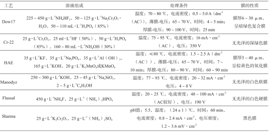 圖9 鎂合金熔煉壓鑄防護工藝裝備 采用合適的熱處理工藝可細化鎂合金的晶粒、調控相結構組成,獲得良好的塑韌性;改善強化相的結構、尺寸、形態、濃度與分布,提高材料力學性能。未來鎂合金熱處理將著重優化現有工藝進一步提高材料的強度與塑性,研究鎂合金熱處理過程強化相析出的組織結構、尺寸與分布演變規律,系統地分析合金元素綜合添加對熱處理微觀組織與力學性能的影響規律與作用機制。 鎂合金耐蝕性、耐磨性差,常通過表面防護以提高其耐蝕耐磨與表層力學性能,常用的表面防護工藝主要有化學氧化(轉化)膜處理、陽極氧化處理、微弧氧化處理、電/化學鍍處理、熱噴涂、物理氣相沉積、化學氣相沉積、高能離子注入、熱擴滲鋁方法、溶膠-凝膠技術、金屬表面協和涂層技術等。 化學轉化可通過化學反應在金屬材料表面生成金屬膠狀物或鹽膜,投資少且操作簡便,主要分為鉻酸鹽系、磷酸鹽系、有機酸系、高錳酸鹽系與氟鋯酸鹽系等。當前主要以鉻酐酸與重鉻酸鹽化學轉化為主,化學轉化膜的耐蝕性主要取決于膜層的厚度與膜層中的鉻元素含量,典型工藝為Dow公司的Dow7工藝,Sharma A K針對Mg-Li合金制備得到了8~11 μm鉻酸鹽膜。由于鉻酸鹽中Cr 6+ 對環境存在污染,目前使用量不斷減少。當前鎂合金化學轉化多選用無鉻化學與稀土化學轉化膜工藝,表13所示為鎂合金常用化學轉化膜的工藝參數。與化學轉化膜相比,陽極氧化處理除表層氧化膜外,還含有電解液或其他元素沉積在金屬材料表面的氧化膜,陽極為鎂合金,陰極多為不銹鋼、鐵、鎳。鎂合金的陽極氧化早期多選用含Cr元素的Dow17、Cr-22工藝,后期選用以磷酸鹽、高錳酸鹽、可溶性硅酸鹽、硫酸鹽、氫氧化物和氟化物為主的無鉻陽極氧化處理工藝(例如HAE工藝、MAGOXID與NEW型無鉻電解液)。鎂合金陽極氧化層分為致密內膜層與多孔型外膜層,一般需進行著色和封閉處理,表14為鎂合金常用的陽極氧化工藝參數。以納米材料和其他低維度非平衡材料為基礎,可通過特定的加工技術在鎂合金表面形成一層納米化的表層膜,或直接在鎂合金表面形成納米結構涂層,起到優異的表面防護效果。日本Mazda公司采用該技術在鎂合金表面形成了50 nm粒狀的S-Al?CuMg納米相與針狀S-Al ?CuMg相,已廣泛應用在汽車發動機氣缸襯套等部件。