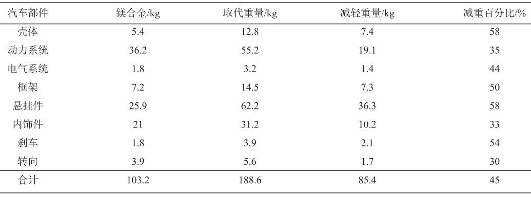 表2 汽車領域用鎂合金減重效果(對比鋁合金)