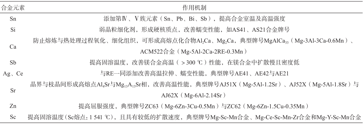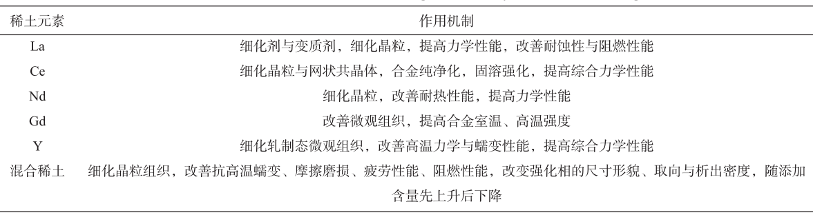 圖3 鎂合金材料的典型應用 3、鎂合金材料研究現狀及發展趨勢 3.1?稀土鎂合金 通過添加稀土元素可提高鎂合金的力學性能與高溫物化性能,稀土元素的作用機制主要包括晶粒細化、晶界強化和固溶強化。表5所示為鎂合金常用稀土添加元素及其作用機制。添加Ca、Sr元素可明顯改善二次相的熱穩定性,添加Si、Zr元素可顯著改善壓鑄鎂合金的高溫蠕變性能。馬健研究指出:當Mg-5Sn-1Si合金Y添加含量由0.2%增至0.8%時,生長抑制因子GRF由16.94提高至17.96,枝晶臂間距由23.7 μm降低至12.5 μm,減少約47%。朱利敏通過添加Sm元素,顯著改善了Mg-8Gd-0.5Zr與Mg-8Gd-3Sm-0.5Zr合金在350~500 ℃變形溫度、0.002~0.1 s-¹應變速率下的變形激活能,細化了再結晶的晶粒尺寸。
