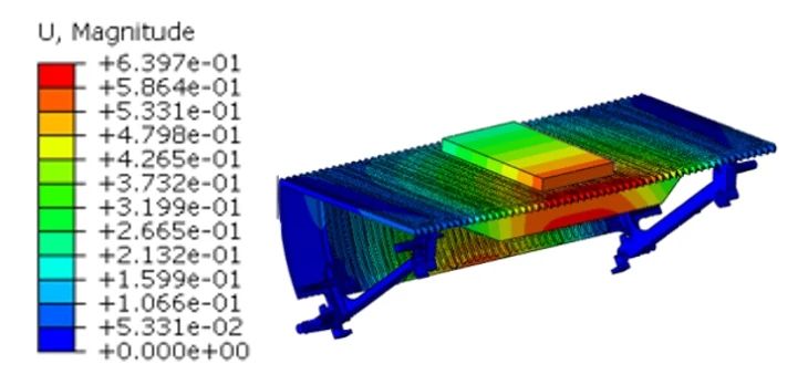 圖7 1000型鋁合金梯級前6階模態分析 1.5 梯級諧響應分析 根據梯級的國家標準,除了靜載荷試驗和模態分析以外,梯級還應進行動載荷試驗,模擬實際使用的工況,驗證梯級的實際性能。試驗應以5~20 Hz之間的任一頻率的無干擾的諧振力波,施加500~3 000 N之間的脈動載荷進行試驗,發現梯級不產生裂紋,踏面表面不產生4 mm變形。在ABAQUS軟件對梯級(結構3)進行諧響應分析,見圖8,20 Hz諧振力波時,梯級最大等效位移為0.64 mm,小于4 mm變形量,見圖9,最大等效應力為51.75 MPa,小于鋁合金A380的屈服強度160 MPa。通過諧響應分析,梯級動載荷下,滿足梯級的國家安全標準。