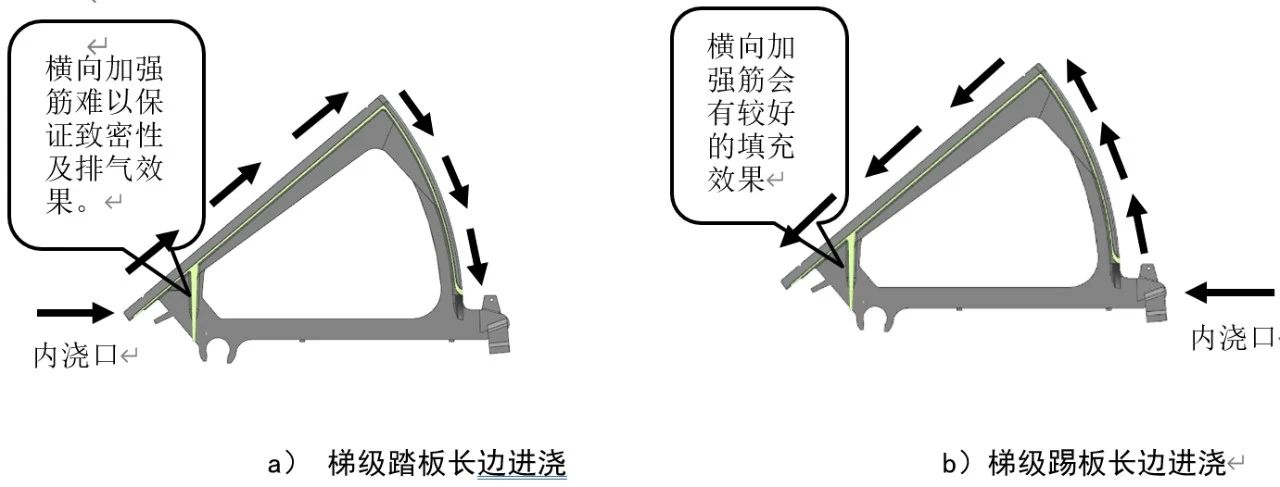 表3 鑄件(A380)壓鑄工藝參數 2.1 澆注系統設計 (1) 內澆口位置選擇 梯級(結構3)上有多條縱向加強筋,在設計澆注系統時,鋁液的填充方向要與加強筋方向一致,使加強筋整條都能得到填充,避免充型過程中出現壓鑄缺陷。梯級踏板內側有一條橫跨梯級的加強筋,此筋板凹陷在型腔內部,若此加強筋壓鑄時強度不足,會出現粘模情況,模具極難處理。因此,鋁液需對其進行正向充填,以使更多的鋁液優先填充加強筋的底部,從而排出加強筋內部的氣體。圖10為內澆口位置選擇。從圖10a可知,如果內澆口選擇在梯級踏板長邊進料,鋁液填充方向在加強筋填充方向上流量過小,鋁液很難沖入加強筋,僅靠壓力流,難以保證加強筋的致密性。從圖10b可知,如果內澆口選擇在梯級踢板長邊進料,鋁液填充方向在加強筋填充方向上流量較大,能有比較好的填充效果。所以,內澆口位置選擇在踢板長邊位置。