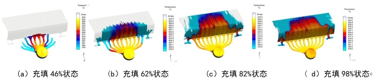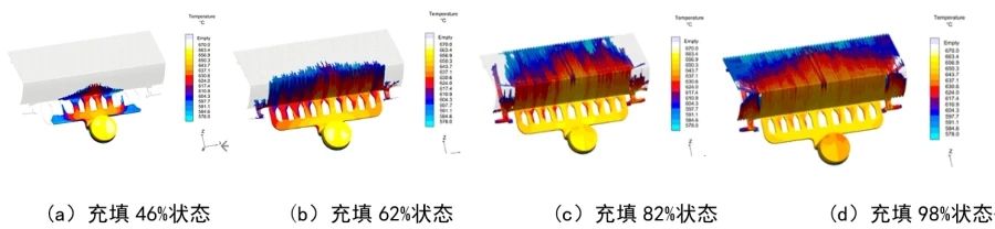 圖12 方案1充填過程分析 方案2:從圖13可以看出,充填達46%時,鋁液在中間分流道充填速度快,兩邊分流道充填速度慢。充填達62%時,流道內有卷氣,鑄件內部卷氣嚴重,料溫較低。充填達82%時,在產品轉角部位出現明顯裹氣,此處存在卷氣風險。充填達98%時,鑄件末端部位出現低于液相線的冷料,此處冷隔風險較高。