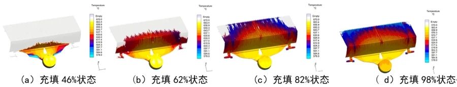 圖13 方案2充填過程分析 方案3:從圖14可以看出,充填達46%時,鋁液充填均勻、充填范圍較寬,有利于鑄件成形。雖然流道部位出現滯留氣體,但模流分析顯示氣體并未隨鋁液進入產品。充填達62%時,充型溫度較好,各部位溫度高于液相線,前鋒冷料可通過溢流槽排出,產品內卷氣風險較低。充填達82%和98%時,鑄件末端有些地方出現卷氣,但可以通過溢流槽排除。