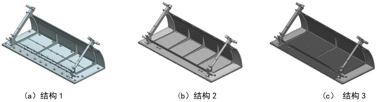 表1 A380化學成分及力學性能 1.2 梯級結構設計 在梯級結構設計中,既要考慮安全、技術要求符合國家標準,同時也要考慮整體式梯級的輕量化以及壓鑄工藝。梯級最大外形尺寸(長×寬×高)為1 009 mm×411 mm×340 mm,對3種不同的梯級結構設計進行分析比較,見圖2。 結構1:梯級壁厚為1.8 mm,橫向有2根主加強筋,筋板厚度為3.5 mm,高度為45 mm,長度為810 mm。同時為加強踏板的剛度,在踏板中間設計了一根小的加強筋。縱向有4根主加強筋,筋板厚度為2 mm,見圖2a。 結構2:梯級壁厚為1.8 mm,橫向有1根主加強筋,筋板厚度為3 mm,高度為65 mm,長度為810 mm。縱向有5根主加強筋,筋板厚度為2.5 mm,見圖2b。 結構3:梯級壁厚為1.8 mm,壁厚均勻,橫向筋板最小端壁厚為3 mm,高度為85 mm,長度為810 mm。縱向有3根主加強筋,筋板厚度2mm,見圖2c。