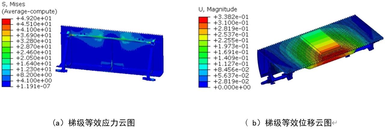 圖5 梯級結構2靜力學分析 (3)結構3:梯級的等效應力見圖6a,最大應力為49.20 MPa,發生在兩邊斜支架與踏面筋板交匯附近。梯級的等效位移見圖6b,最大位移為0.34 mm,發生在踏面邊緣的中間位置。