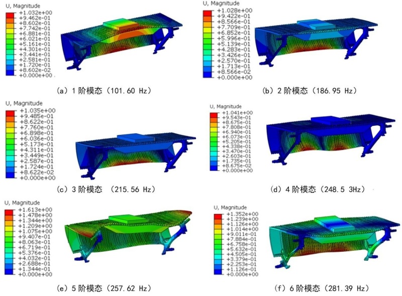 圖6 梯級結構3靜力學分析 通過以上3種不同結構的靜力學對比分析,結構3在最大應力和最大位移上均小于結構1和結構2,安全系數為3.25。同時在質量上,結構3比結構1、2分別減少了21%和5%,有效實現了“輕量化”設計。因此,結構3的結構更加合理,成本更低,安全系數更高,為最優設計方案。 1.4 梯級模態分析 利用ABAQUS軟件對梯級(結構3)進行模態分析,在主輪和輔輪所在的軸套施加固定約束,鋁合金梯級前6階模態的振型和振幅見圖7。其中第1階模態,頻率為101.60 Hz,振幅為1.032 mm;第2階模態,頻率為186.95 Hz,振幅為1.028 mm;第3階模態,頻率為215.56 Hz,振幅為1.035 mm;第4階模態,頻率為248.53 Hz,振幅為1.041 mm;第5階模態,頻率為257.62 Hz,振幅為1.613 mm;第6階模態,頻率為281.39 Hz,振幅為1.352 mm。通過模態分析可知,梯級的固有頻率大于2 0Hz。