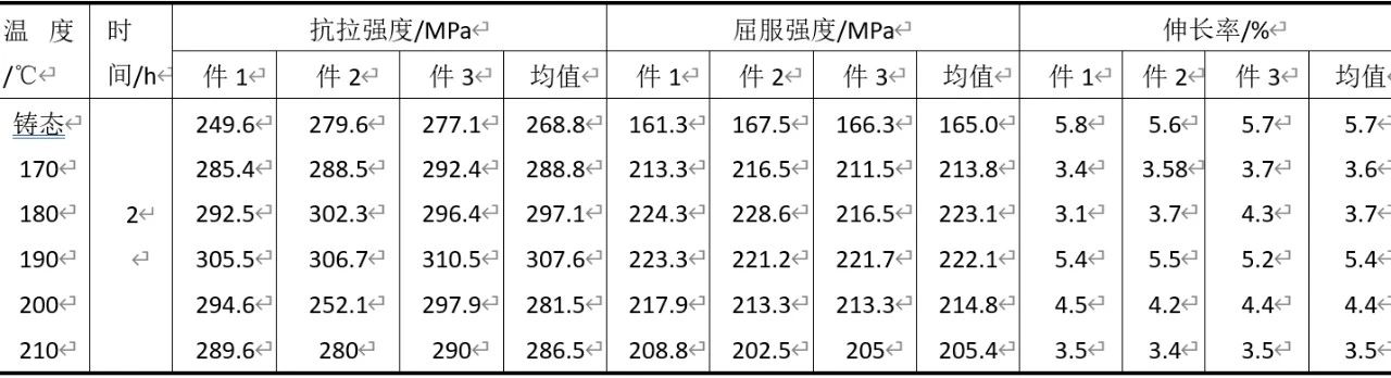 4、熱處理工藝效果 鋁合金鑄件熱處理目的是提高合金的力學(xué)性能,增強(qiáng)耐腐蝕性能,改善加工性能,獲得尺寸的穩(wěn)定性。鋁合金的時效硬化不僅決定于合金的組成、時效工藝,還取決于合金在生產(chǎn)過程中的缺陷,特別是空位、位錯的數(shù)量和分布等,目前普遍認(rèn)為時效硬化是溶質(zhì)原子偏聚形成硬化區(qū)的結(jié)果。AlSi10MnMg薄壁壓鑄零件在T5及T6的適當(dāng)工藝參數(shù),都能得到較好的性能要求。由于固溶熱處理工藝較為復(fù)雜,并且較高的溫度容易導(dǎo)致薄壁壓鑄件變形超差,且薄壁該零件可以在2h可以得到均勻的溶解,因此以溫度為變量采用人工時效處理。 選取人工時效溫度范圍為170~210 ℃,每間隔10 ℃作為1組,保溫時間均為2 h。采用Sx2-12-6電阻爐進(jìn)行人工時效,額定功率為12 kW,爐膛尺寸為550 mm×550 mm×450 mm;將每組3個試片懸掛放置入爐膛中間部位,通風(fēng),升溫15 min到達(dá)規(guī)定時效溫度,隨后自動保溫計(jì)時,最后由人工將試片取出空氣中冷卻。 使用WDW-50E萬能拉伸試驗(yàn)機(jī)在室溫條件下進(jìn)行拉伸測試,拉伸測試過程依據(jù)國標(biāo)GB/T228.1-2010,見圖10,伸長率由卡尺測量拉伸前后數(shù)值計(jì)算獲得,每組3件,測試結(jié)果見表3。
