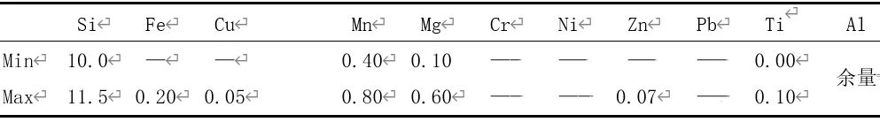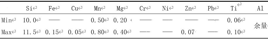 表1 AlSi10MnMg的化學(xué)成分 wb/% 由表1可知,標(biāo)準(zhǔn)中規(guī)定的AlSi10MnMg鋁合金中,Mg含量為0.1%~0.6%,范圍比較寬。吳樹森等研究發(fā)現(xiàn),Mg含量的增加與抗拉強(qiáng)度與屈服極限正相關(guān),與伸長率負(fù)相關(guān)。過低的Mg不能產(chǎn)生足夠的強(qiáng)度,也不利于后續(xù)的熱處理,而過高的Mg能導(dǎo)致伸長率降低,Mg與Si形成Mg2Si強(qiáng)化相,使得α-Al固溶體結(jié)晶點(diǎn)陣發(fā)生畸變,從而起到強(qiáng)化合金的作用。Mg的含量為 0.20%~0.40%可以取得較好的綜合力學(xué)性能。 Fe是壓鑄鋁合金中一種有害元素,其以FeAl3和Al-Si-Fe的片狀或者針狀組織存在,降低合金的力學(xué)性能,F(xiàn)e含量要低于0.15%,Mn元素可以與Fe形成化合物,進(jìn)一步消除鐵有害因素,同時Mn可以提高產(chǎn)品球狀結(jié)晶組織含量,將Mn含量保持為0.50%~0.80%。 適當(dāng)增加Ti能顯著細(xì)化鋁合金的晶粒組織,提高合金的力學(xué)性能,降低合金熱裂紋傾向,故將Ti含量控制為0.06%~0.10%之間。由此,調(diào)整后壓鑄鋁合金的成分見表2。