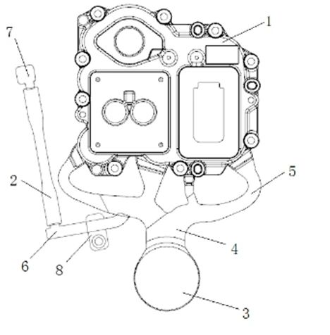 表2 試驗(yàn)材料成分AlSi10MnMg wb/% 3、模具設(shè)計(jì)與數(shù)值模擬 圖2為該電池罩蓋澆注系統(tǒng)基本結(jié)構(gòu),總投影面積為290 c㎡, 澆注總質(zhì)量為0.78 kg,選用UB350ic壓鑄機(jī),該設(shè)備鎖模力為3 500 kN。設(shè)計(jì)模具每模1件,壓室直徑為ø60mm,料缸充滿度35%。模具有五個分支澆道,其中左側(cè)分支澆道制造伴隨鑄件的試片2,并通過阻斷器8控制是否需要制造試片。根據(jù)該產(chǎn)品要求,鑄件內(nèi)左下側(cè)“眼鏡孔”區(qū)域、 右下側(cè)“矩形方框” 區(qū)域、澆注末端“圓孔”區(qū)域安裝傳感器等零部件,這3個部位是通孔,并且該區(qū)域加工后所有加工表面氣孔應(yīng)小于0.6 mm。鑄件4個分支澆道呈梳狀結(jié)構(gòu),內(nèi)澆口長度為75 mm,澆口厚度為2.0mm,為凝固模數(shù)的2/3,總澆口截面積為150 m㎡,計(jì)算可得平均流速為40 m/s左右。壓鑄模采用FS438壓鑄熱作模具鋼,其具有良好的淬透性、韌性、熱強(qiáng)性、熱疲勞性能,熱處理變形小等。冷卻介質(zhì)為水,局部采用10 kg/c㎡的可編程間斷高壓點(diǎn)冷卻,自然排氣,通過模擬分析確定渣包位置以及排氣波板的設(shè)計(jì)。