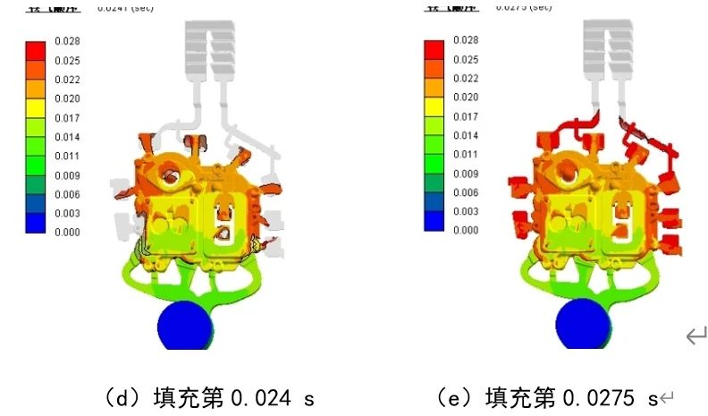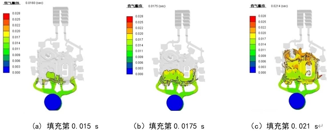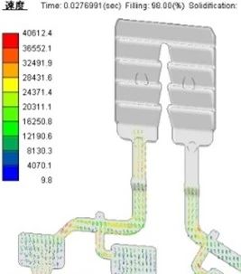 圖3 電池罩蓋填充卷氣模擬 圖4為填充0.277 s時的速度云圖。“π”型排氣波板是將一個傳統(tǒng)的排氣波板中間隔離,同時保留末端連通,一般左右兩邊隔離長度為4~5個牙扣,該結(jié)構(gòu)既可以保證左右兩側(cè)氣體排出互不干擾,同時縮小空間,節(jié)省加工制造成本。從圖4可以看出,該時刻左側(cè)鋁液達(dá)到第一牙扣,右側(cè)即將抵達(dá)第一牙扣,使用粒子跟蹤技術(shù)測量左側(cè)前端速度為12 m/s,右側(cè)為1 3m/s,由于波板平均間隙為0.7 mm,兩股鋁液經(jīng)過第一牙扣后速度迅速下降,到第二牙扣幾乎停止運(yùn)動,鋁液最終停止的位置與鋁液粘度、模具溫度以及鑄造壓力等有關(guān),設(shè)計(jì)左右兩側(cè)分別獨(dú)立4個牙扣,在第5~8個牙扣連通,實(shí)踐證明“π”型排氣波板設(shè)計(jì)合理,生產(chǎn)過程使用可靠。
