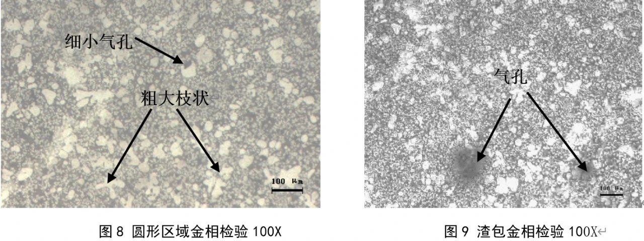 在產(chǎn)品3個重要區(qū)域取切片拋光并在10%燒堿溶液中腐蝕,使用AX10蔡司金相顯微鏡進(jìn)行組織觀察,見圖8,白亮α鋁多數(shù)為塊狀或枝狀,晶粒尺寸較為粗大,個別尺寸大于80 um, 細(xì)小暗黑色Al-Si合金分布于α鋁周邊,較為均勻,但仍可見細(xì)小氣縮孔,孔隙率為3.5%。取圓孔內(nèi)渣包進(jìn)行金相檢驗(yàn),見圖9,發(fā)現(xiàn)有多個呈圓形黑色氣孔空洞,且周邊存在密集分布細(xì)小孔洞,經(jīng)圖像識別測量,渣包內(nèi)孔隙率為大于9%,說明該處渣包實(shí)現(xiàn)集氣及排渣的功能,氣體是在鋁液流動前端被高速卷入渣包,在高壓下被壓縮為孔洞。該現(xiàn)象與模擬分析結(jié)果基本一致,說明模具渣包設(shè)計(jì)較為合理。