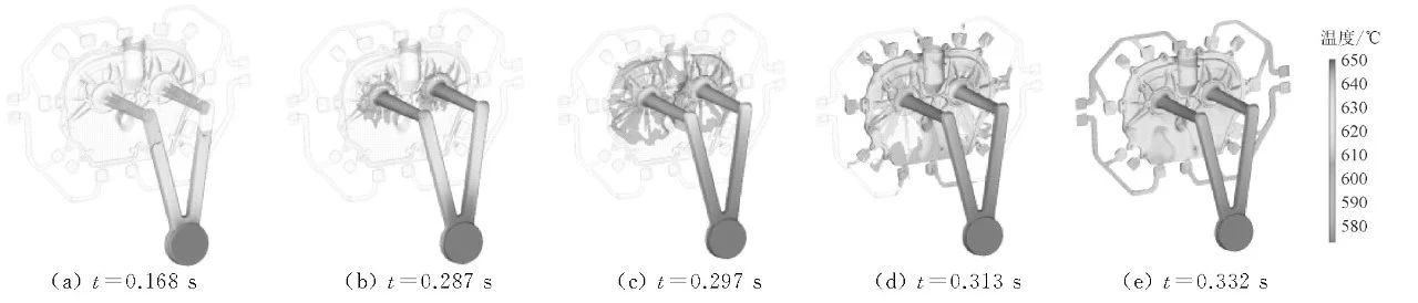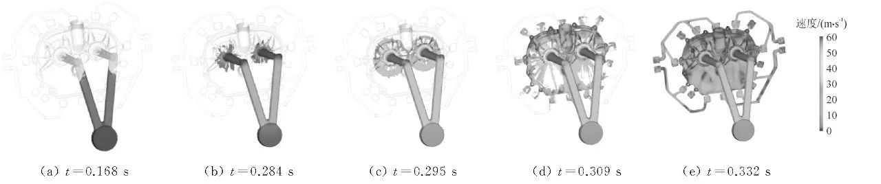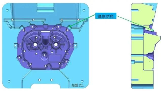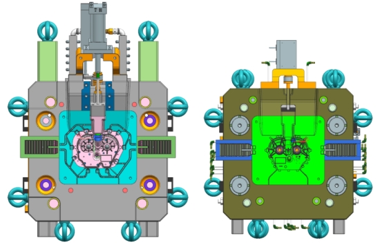 圖4 模具鑲嵌方式 經(jīng)過(guò)對(duì)壓鑄件的分析, 要避開(kāi)密封槽的位置進(jìn)澆, 壓鑄件上唯一可以選取的位置只有壓鑄件中間的兩個(gè)孔位, 而且壓鑄件的基本形狀呈圓形餅狀結(jié)構(gòu), 兩孔位在中間位置, 筋條呈輻射傘狀, 所以采用中心進(jìn)澆對(duì)壓鑄件的排氣等都有非常好的效果, 因此決定采用雙中心進(jìn)澆三模板的設(shè)計(jì), 見(jiàn)圖5。
