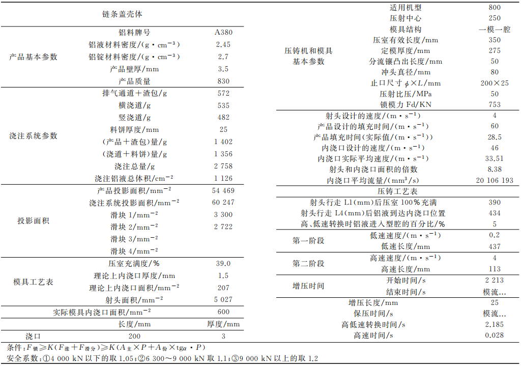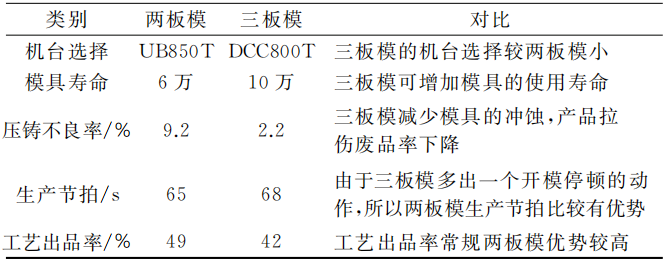 表2 兩模板和三模板生產(chǎn)效果對(duì)比 切刀材料材質(zhì)為H13, 硬度為HRC44~46, 刀口成45°角, 可避免粘鋁現(xiàn)象。彈性鎖模裝置鎖緊力為40kN, 避免動(dòng)模板與定模移動(dòng)板提前分離。模具的導(dǎo)柱與模板制作精度要高, 定模固定板、定模移動(dòng)板、動(dòng)模板需要同時(shí)配模, 合模油要分布均勻.模具安裝到壓鑄機(jī)上, 用手推動(dòng)定模移動(dòng)板, 需無(wú)明顯卡頓現(xiàn)象。