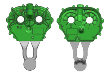 圖9 實(shí)際產(chǎn)品圖 兩板模結(jié)構(gòu)設(shè)計(jì)成熟, 機(jī)構(gòu)穩(wěn)定, 出品率高, 在實(shí)際生產(chǎn)中應(yīng)用廣泛。三板模主澆道提前分離結(jié)構(gòu)優(yōu)點(diǎn)是適用于各種圓形餅狀類(lèi)產(chǎn)品, 只是結(jié)構(gòu)或樣式可能不同, 需根據(jù)實(shí)際情況設(shè)計(jì), 該應(yīng)用打破了常規(guī)壓鑄方案進(jìn)澆的思路, 大大提高了壓鑄工藝的適用范圍。