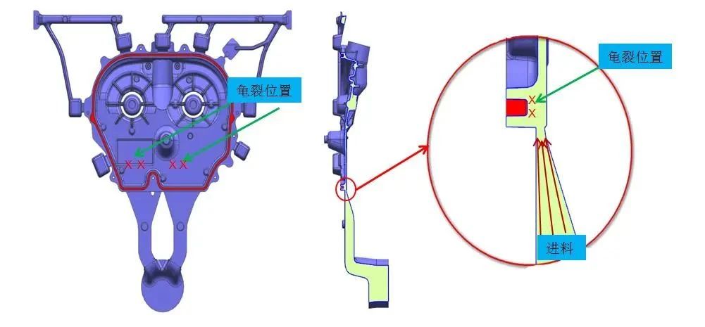 ![]() 壓鑄工藝在目前的汽車(chē)零部件輕量化生產(chǎn)方面起著重要的作用。對(duì)于一些周邊設(shè)計(jì)為封閉形式的蓋類(lèi)汽車(chē)用壓鑄鋁合金零件, 模具設(shè)計(jì)時(shí)無(wú)論選擇周邊何處作為進(jìn)澆口, 均會(huì)對(duì)模具重要成形部位———密封槽位置造成沖蝕, 導(dǎo)致模具部分失效 (一般2萬(wàn)模次左右) 。目前常用的對(duì)策方法是設(shè)計(jì)為鑲拼結(jié)構(gòu), 對(duì)易損部位更換處置。 結(jié)合實(shí)際生產(chǎn), 提出一種新型設(shè)計(jì)方案, 采用了三板模——雙中心進(jìn)澆結(jié)構(gòu), 優(yōu)化了鎖模、限位等結(jié)構(gòu), 匹配壓鑄機(jī)臺(tái)部分功能, 使模具壽命有較大延長(zhǎng),現(xiàn)場(chǎng)生產(chǎn)效果顯著。某V8發(fā)動(dòng)機(jī)鏈條蓋殼體,見(jiàn)圖1,材質(zhì)為A380鋁合金,密度為2.45g/cm³,輪廓尺寸為305.059mm×243.811mm×88.683mm,其質(zhì)量為0.83kg, 體積為309cm³, 表面積為856.03c㎡, 基本壁厚≥2.1mm, 鑄件收縮率為0.55%, 因?yàn)槭敲芊獠劢Y(jié)構(gòu), 有平面度要求。生產(chǎn)中發(fā)現(xiàn)由于壓鑄件結(jié)構(gòu)特殊, 內(nèi)澆口直沖壓鑄件的密封條安裝槽內(nèi)側(cè), 造成模具此處位置過(guò)早龜裂, 并導(dǎo)致壓鑄件上形成了凸起的龜裂紋,由于此處是安裝 密封條位置, 如果壓鑄件上有龜裂紋, 會(huì)對(duì)壓鑄件的密封有嚴(yán)重影響, 所以對(duì)此處的鑄件表面質(zhì)量有嚴(yán)格要求。經(jīng)分析試驗(yàn), 采用了中心進(jìn)澆三板模結(jié)構(gòu)。針對(duì)壓鑄件的基本情況, 進(jìn)行了初步設(shè)計(jì)。選擇遠(yuǎn)端進(jìn)澆以減少對(duì)中心兩個(gè)型芯的直接沖蝕力度, 配合一般設(shè)計(jì)規(guī)范。圖2為初始設(shè)計(jì)方案。