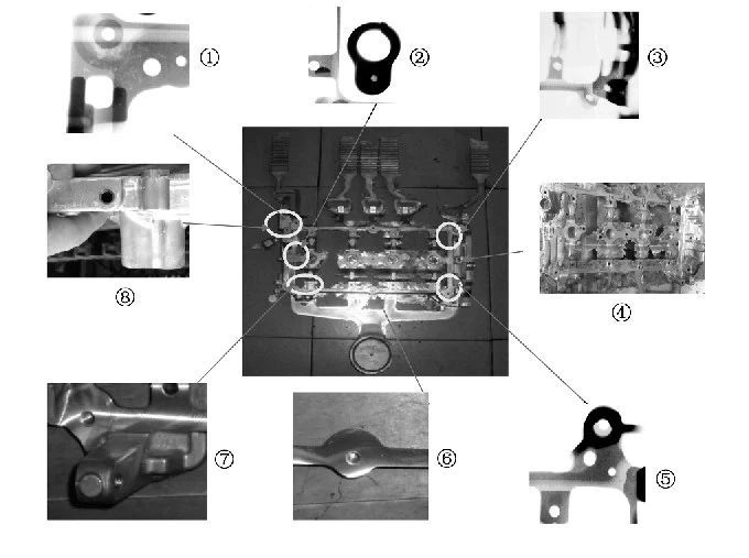 圖8 產(chǎn)品分區(qū)劃分及加工后廢品缺陷分布 凸輪軸支架生產(chǎn)過程出現(xiàn)的問題主要見圖9:①產(chǎn)品填充末端油道孔附近氣孔,機(jī)加工后油道孔與墊片安裝面氣孔外露;②φ18mm傳感器孔由于結(jié)構(gòu)設(shè)計(jì)原因,很容易在該位置形成氣縮孔,實(shí)際生產(chǎn)中該孔機(jī)加工后報(bào)廢率也很高;③產(chǎn)品填充末端墊片安裝面與鏈條蓋安裝面氣孔,機(jī)加工后氣孔外露嚴(yán)重;④鑄件飛料嚴(yán)重,披縫很厚,產(chǎn)品清理與模面清理困難;⑤入料口右側(cè)墊片安裝面夾層;⑥入料口M6螺紋孔夾層;⑦入料口左側(cè)墊片安裝面夾層;⑧油道孔加工不過。