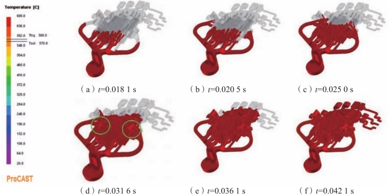 表3 壓鑄成形周期 3.2.2 充型過程分析 圖6所示為金屬液的充型過程,整個(gè)充型時(shí)間為0.042 s。開始時(shí),金屬液通過內(nèi)澆道后首先填充鑄件散熱片薄板部分,再通過兩側(cè)的內(nèi)澆道從兩端進(jìn)入型腔,在中部充填完成后金屬液向頂部流動(dòng)直至充滿,最后充填距離澆道最遠(yuǎn)的溢流槽。但在金屬液充填的過程中,由于澆道的設(shè)置還存在問題,一部分金屬液會(huì)通過中間的澆道率先填充散熱片薄板部分,再通過外側(cè)澆道進(jìn)入型腔,存在多股金屬液匯流,容易形成冷隔和裹氣,如圖6d中圈出所示。澆注系統(tǒng)基本合理,但仍有優(yōu)化改進(jìn)的空間。