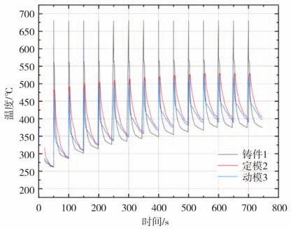 圖6 車燈支架鑄件充型過程 3.2.3 模具熱平衡及溫度場分析 為了滿足產(chǎn)品質(zhì)量和生產(chǎn)效率的要求,通過熱平衡分析,獲得在壓鑄過程中型腔內(nèi)溫度的分布情況和變化趨勢,有助于確定溫度控制的敏感區(qū)域,采取措施降低溫度波動(dòng),實(shí)現(xiàn)模具溫度場的均勻性控制,并為制定合理的溫度場規(guī)劃提供參考。模具溫度場均勻不僅有利于延長模具使用壽命,還可以提高鑄件質(zhì)量,所以進(jìn)行模具的熱平衡分析和溫度場分析是非常重要的。 在鑄件、定模和動(dòng)模的表面各選取一點(diǎn),如圖7所示,繪制溫度-時(shí)間曲線,如圖8所示,可以看出,經(jīng)過12次的壓鑄循環(huán),模具已經(jīng)基本達(dá)到熱平衡狀態(tài)。