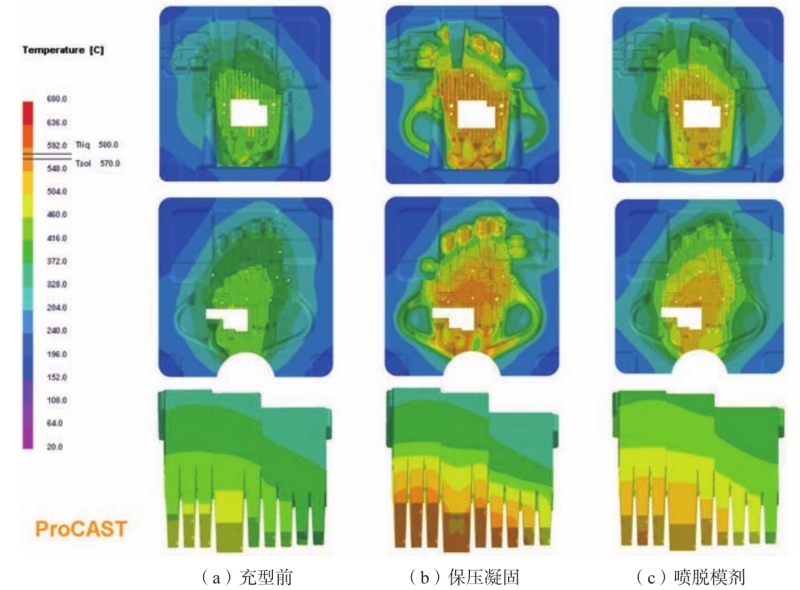 圖8 三點(diǎn)溫度-時(shí)間曲線 在模具達(dá)到熱平衡后,選取下一個(gè)循環(huán)的溫度場進(jìn)行分析。如圖9所示,從左至右分別為動(dòng)模、定模和定模鑲塊在充型前、保壓凝固和噴脫模劑三個(gè)階段的溫度分布情況。在充型前,模具的溫度場分布比較均勻,金屬液充填時(shí),模具的型腔表面溫度會(huì)隨著金屬液的進(jìn)入急劇升高;在保壓凝固階段,模具與冷卻水之間的換熱以及向空氣中散熱使得溫度逐漸下降,因?yàn)樾颓唤Y(jié)構(gòu)復(fù)雜,溫度場并不均勻,局部溫度較高,使得鑄件各部位凝固時(shí)間有一定的差異,但總體溫度場型腔表面的溫度梯度較小;開模取件時(shí),模具表面與空氣大面積接觸,同時(shí)在脫模劑的作用下,模具型腔表面溫度迅速降低,模具型腔以及鑲塊大部分的表面溫度下降到500 ℃以下。 從模具溫度場的分析結(jié)果來看,動(dòng)模和定模型腔表面溫度場分布較為均勻,但局部溫度過高,有熱節(jié)存在,仍有優(yōu)化空間。