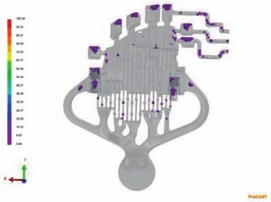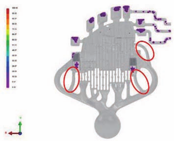 圖10 鑄件縮孔、縮松分布 4、工藝改進(jìn)與壓鑄生產(chǎn) 為了改善在鑄件兩端澆道流量不夠和一側(cè)型芯影響下流量較小,導(dǎo)致多股金屬液匯流形成冷隔和裹氣的現(xiàn)象,在兩端匯流處以及一側(cè)金屬液填充不足的位置共增加三處內(nèi)澆道,如圖11紅圈所示,使充型過程更加平穩(wěn)以及均勻;并且由于散熱薄板上無法設(shè)置溢流槽,為改善筋部排氣情況,增加頂桿,消除了冷隔,提高了鑄件的成形質(zhì)量。