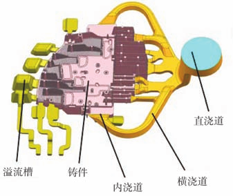 表1 EN AC44300鋁合金化學(xué)成分 wB/% 2、壓鑄工藝及模具設(shè)計(jì) 2.1 分型面選擇 根據(jù)車燈支架鑄件的結(jié)構(gòu)特點(diǎn),將分型面選在鑄件投影面積最大的頂部安裝孔所在平面。 2.2 澆道設(shè)計(jì) 澆注系統(tǒng)不僅對金屬液在模具型腔內(nèi)的流向與狀態(tài)、排氣條件、模具的壓力傳遞起到重要的控制作用,還能夠調(diào)節(jié)填充速度、填充時(shí)間和模具的溫度分布。 為了使金屬液的流程盡量短,減少不必要的熱量損耗,同時(shí)為避免金屬液直接沖擊型芯,將內(nèi)澆道位置設(shè)置在鑄件的頂部和兩端的直邊處,如圖2所示。內(nèi)澆道的截面積計(jì)算:
