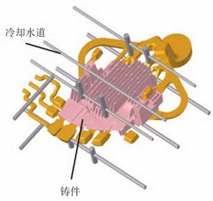 圖2 澆排系統(tǒng)設(shè)計(jì) 2.4 冷卻系統(tǒng) 冷卻系統(tǒng)對壓鑄產(chǎn)品的成形質(zhì)量具有決定性的影響。如圖3所示為該制品的壓鑄模具內(nèi)部冷卻水道布置方案,水道均勻分布在鑄件四周,有利于模具溫度場均勻。
