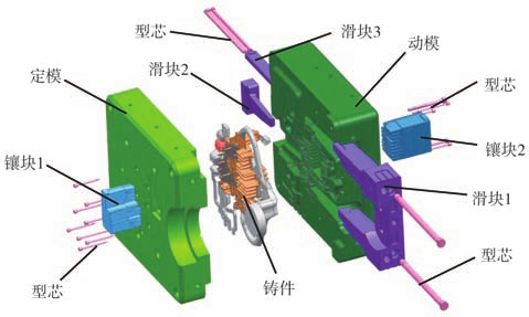 圖3 冷卻水道分布 2.5 模具結(jié)構(gòu) 本副模具模芯長寬分別為350 mm和300 mm。模芯結(jié)構(gòu)如圖4所示,定模芯包含鑲塊1,動(dòng)模芯部分包含鑲塊2,鑄件周圍形狀由3個(gè)滑塊成形,為了便于維修和更換,降低成本,在17個(gè)深孔部位做成可更換的長銷型芯。