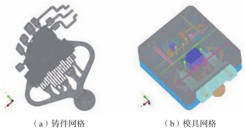 圖4 模芯結(jié)構(gòu) 3、CAE分析 3.1 前處理 采用HyperMesh軟件對鑄件進(jìn)行CAE前處理,得到高質(zhì)量面網(wǎng)格模型,再將之輸入ProCAST軟件的MeshCAST模塊,創(chuàng)建體網(wǎng)格。分別設(shè)置網(wǎng)格單元尺寸:鑄件為1 mm,動(dòng)模芯、定模芯、滑塊、型芯和水道為2 mm,整體網(wǎng)格數(shù)量為1 954萬,鑄件、模具的網(wǎng)格模型如圖5所示。