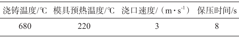 圖5 鑄件及模具網(wǎng)格劃分 3.2 數(shù)值模擬分析 3.2.1 初始和邊界條件 模具材料為H13鋼,壓鑄工藝參數(shù)如表2所示。模具與鑄件間的換熱系數(shù)設(shè)為20 000 W/(㎡·K),動(dòng)模與定模之間的換熱系數(shù)為1 000 W/(㎡·K),模具與空氣間傳熱系數(shù)為100 W/(㎡·K),脫模劑與模具間換熱系數(shù)設(shè)為100 W/(㎡·K)。冷卻水與模具的換熱系數(shù)為5 000 W/(㎡·K),冷卻水和脫模劑溫度均為20 ℃。