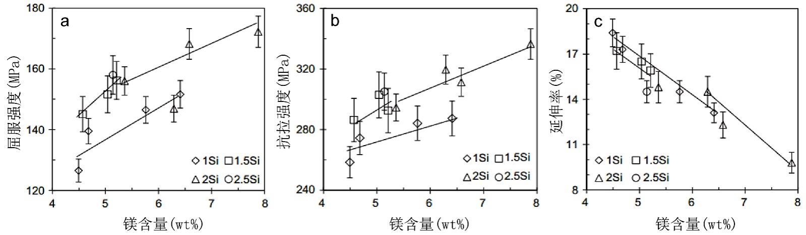 表2 國內(nèi)廠家研發(fā)免熱處理壓鑄鋁合金匯總 2、新能源汽車一體化壓鑄鋁合金開發(fā) (1)合金元素對Al-Mg系免熱處理壓鑄鋁合金的作用 Mg作為壓鑄Al-Mg合金中除Al外含量最高的元素,在Al中的固溶度可達17.4%,具有良好的固溶強化作用,在提高合金強度的同時不影響合金的韌性,還可提高合金的流動性和抗熱裂傾向,并減輕粘模現(xiàn)象。但過量Mg不僅會發(fā)生氧化,還會降低合金的鑄造性能,并與Al形成Al3Mg2相,對合金的力學性能與耐蝕性能產(chǎn)生不利影響。免熱處理壓鑄Al-Mg合金的鑄態(tài)組織主要為樹枝晶、大尺寸顆粒狀α1-Al晶粒、細小球狀α2-Al晶粒和共晶組織,見圖1。通過調(diào)控元素成分,添加微量元素,可以顯著改善合金的力學性能。Si可與Mg形成Mg2Si共晶相,是Al-Mg系免熱處理壓鑄鋁合金的主強化相,Mg、Si對合金性能影響見圖2。為促進鑄態(tài)下合金強度、延展性與耐蝕性的提高,應使Mg和Si全部形成理想的Mg2Si顆粒,因此Mg和Si的質(zhì)量比應為1.73∶1(對應于Mg2Si的2∶1化學計量比)。為增強合金鑄態(tài)下的固溶強化,合金中Mg、Si含量應處于Mg2Si在Al中最大溶解度1.85%附近。