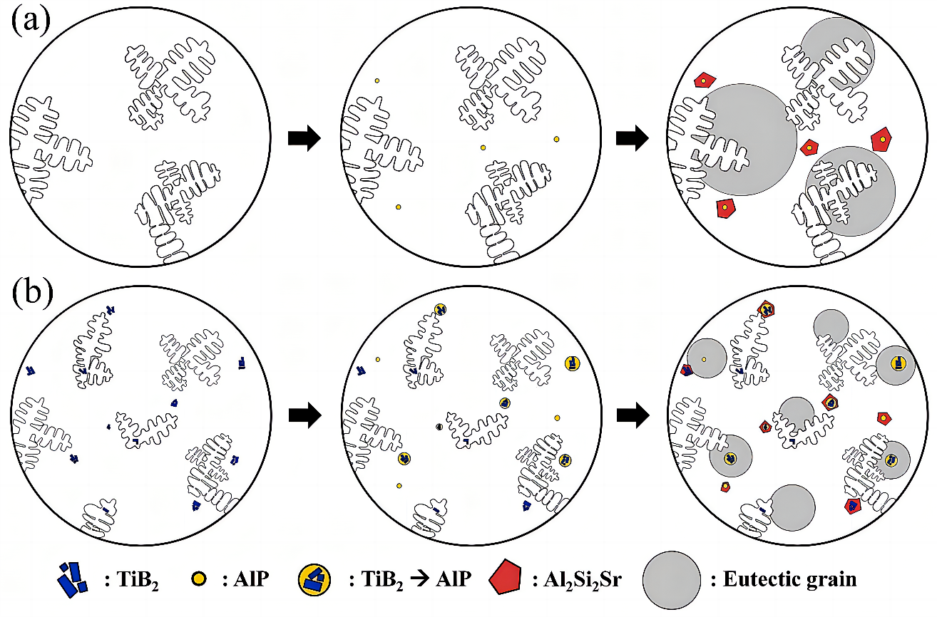 圖2 Mg、Si含量對Al-Mg-Si壓鑄鋁合金鑄態(tài)力學性能的影響 (2)合金元素對Al-Si系免熱處理壓鑄鋁合金的作用 Si在免熱處理壓鑄Al-Si系合金中含量一般在4.0%~11.5%之間。隨著Si含量提高,α-Al枝晶晶粒不斷得到細化,Mg2Si強化相和共晶Si相數(shù)量持續(xù)增加,其中共晶Si相的尺寸及形貌顯著影響合金性能,應盡量使共晶Si相呈球狀或纖維狀均勻分布,以此改善合金的強韌性。免熱處理壓鑄Al-Si系合金鑄態(tài)組織主要為均勻細小的α-Al枝晶、共晶Si及其他顆粒狀第二相。該合金的強化需調(diào)控合金成分與添加細化劑、變質(zhì)劑,細化初生α-Al相、減小二次枝晶臂間距及改善共晶Si形貌。圖3為添加變質(zhì)元素Sr和復合添加Sr與細化劑Al-Ti-B后Al-Si-Mg合金的微觀組織凝固示意圖。