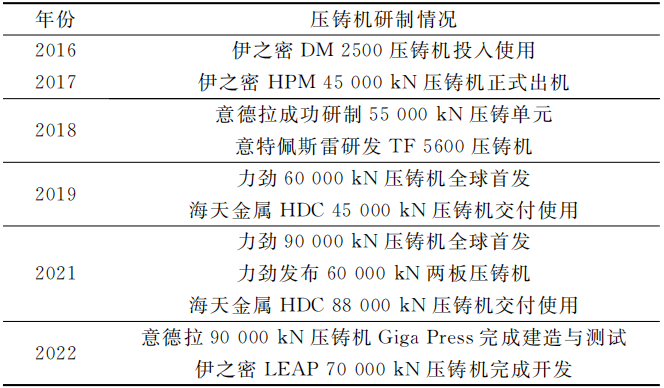 3、新能源汽車一體化壓鑄設(shè)備研制現(xiàn)狀 新能源汽車大多采用冷室壓鑄機,是一體化壓鑄的核心裝備,根據(jù)鎖模力大小可分為小型(<4000kN)、中型(4000~10000kN)和大型(≥10000kN)壓鑄機。由于壓鑄機的鎖模力大小需覆蓋所壓部件的投影面積,故大型車身結(jié)構(gòu)件如后底板、前艙架等需要鎖模力至少為60000kN的壓鑄機,而結(jié)構(gòu)件投影面積越大,所需壓鑄機的鎖模力越大,如壓鑄電池托盤、中底板所需鎖模力為80000~120000kN,壓鑄整個底盤、白車身所需的鎖模力為120000~200000kN。目前,全球具備60000kN以上超大型壓鑄設(shè)備生產(chǎn)能力的廠商為瑞士布勒、海天金屬、伊之密、力勁科技及其子品牌IDRA等。一體化壓鑄用大型壓鑄設(shè)備的研制情況見表3。未來新能源汽車要采用一體化壓鑄技術(shù),必須大量采購超大型壓鑄設(shè)備,因此量產(chǎn)超大型一體化壓鑄設(shè)備仍是當前一體化壓鑄技術(shù)快速發(fā)展的關(guān)鍵壁壘之一。