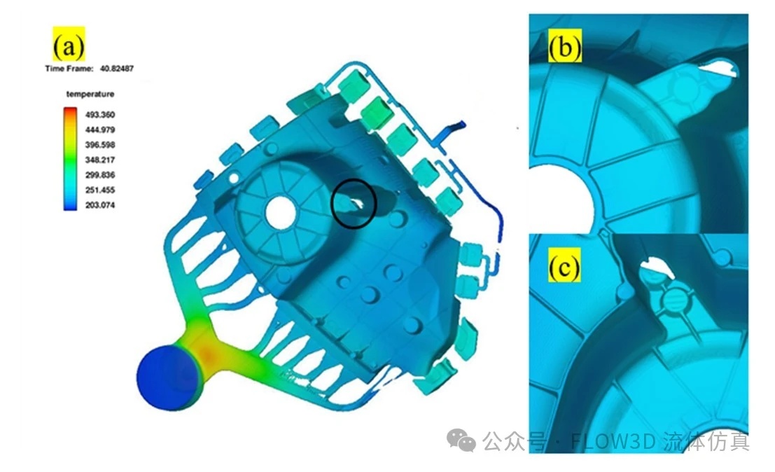 圖6. 凝固過程模擬(a)完全凝固;(b)凸起結構上部放大圖-凸面;(c)凸起結構上部放大圖-凹面。 圖6為金屬液完全凝固后所得鑄件的形狀??梢钥吹?,在減震塔零件中的凸起結構上部存在一較大的孔洞缺陷,觀察其局部放大圖可以發現,在該處存在兩個尺寸較大的近圓柱形凸臺,高度達到20mm。在凝固過程中,這一厚大部位凝固速度較慢,會發生補縮現象,形成孔洞。 對此,采取局部冷卻的方法加快該部位的凝固速度,以獲得致密的鑄件。在該處的模具上加入銅塊以達到快速冷卻的目的,其模擬結果如圖7所示,得到內部致密無孔松的優質鑄件。最后采用該工藝實際生產出合格的鋁合金減震塔零件,成品率達到90%以上。若通過控制模具溫度等其他條件,成品率有望進一步提高。